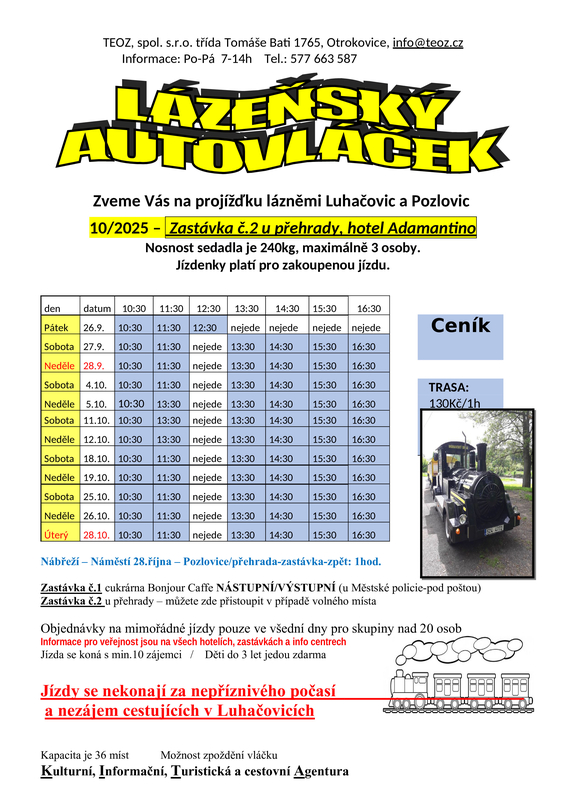 Od roku 2005 patří k turistickým atrakcím v Luhačovicích jízda autovláčkem. Jízdní řád vláčku je zveřejněn v Městském informačním a turistickém centru, na nástupní stanici na ulici Nábřeží u Městské policie a u Luhačovické přehrady. Provozuje: www.teoz.cz