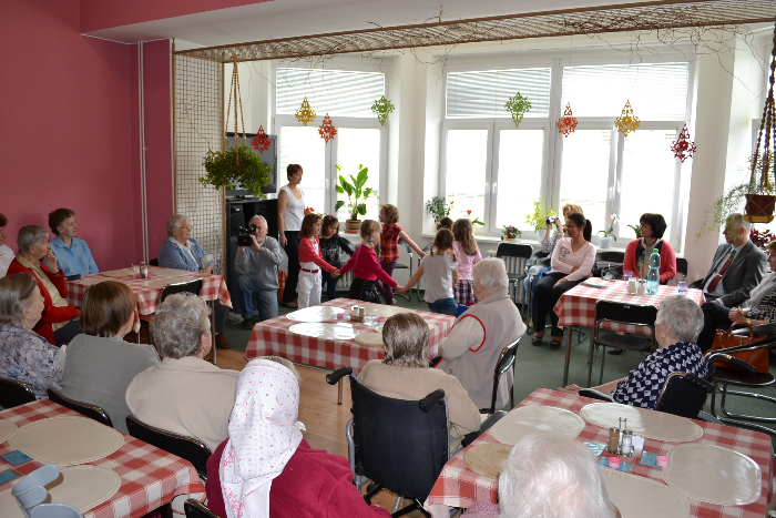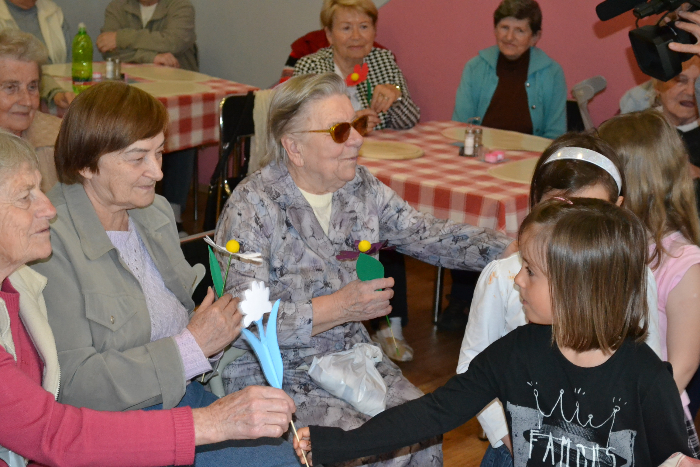 Při návštěvě u příležitosti období svátku matek seniorky dostaly také květiny, a to dokonce dvojí. Ty z papíru jim osobně předaly děti z místní mateřinky, které je také vyrobily. Děvčátka ze školky jim navíc zazpívala písničky, zatančila a zarecitovala básničky. Po vystoupení si obyvatelky domovů krátce povykládaly se zástupci města, například o kulturních akcích a dění v Luhačovicích. „Zveme Vás také na tradiční setkání seniorů ve středu 21. května v domu kultury," připomenul rovněž starosta Hubáček.