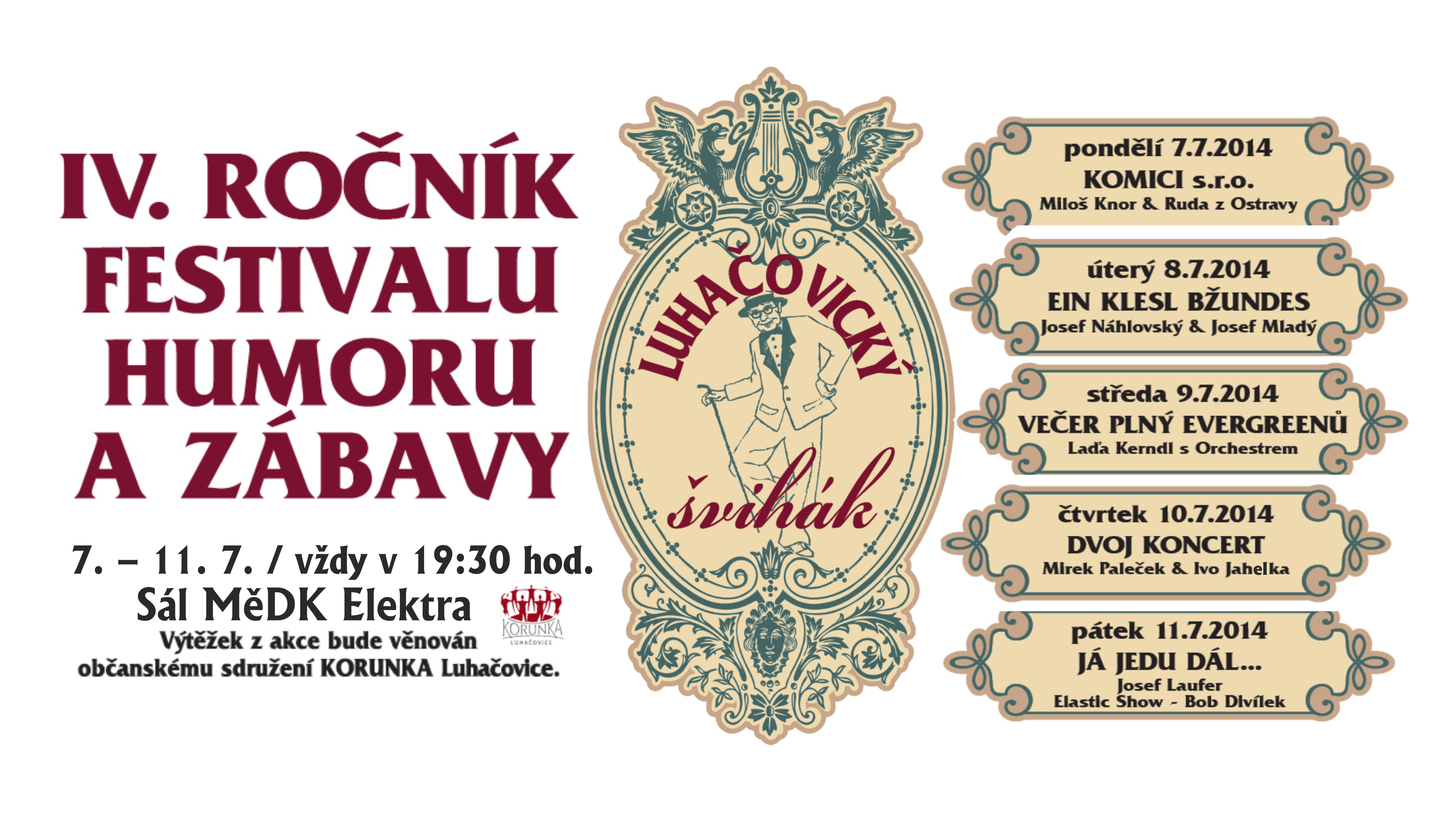 Zábava a humor k lázeňskému prostředí neodmyslitelně patří, stejně tak jako do Luhačovic patří známý komik J. A. Náhlovský, který úspěšný festival organizuje. V neděli můžete sledovat na tenisových kurtech vyhlášený turnaj osobností a od pondělí do pátku vždy od 19.30 se budou sále Rondo střídat Miloš Knor a Ruda z Ostravy (pondělí), Josef Náhlovský a Josef Mladý (úterý), Laďa Kerdl s orchestrem (středa), Mirek Paleček a Ivo Jahelka (čtvrtek) a Josef Laufer a Elastic Show–Bob Divílek zakončí festival v pátek. Účastí na koncertech a představeních se můžete nejenom dobře pobavit, ale také pomoci zpříjemnit život lidem, kterým mnohdy moc do smíchu není. Výtěžek akce bude věnován občanskému sdružení Korunka, které se dlouhodobě věnuje pomoci nemocným a opuštěným dětem. Vstupenky jsou v předprodeji v MTIC Luhainfo, Masarykova 950, Luhačovice, tel.: 577 133 980,
