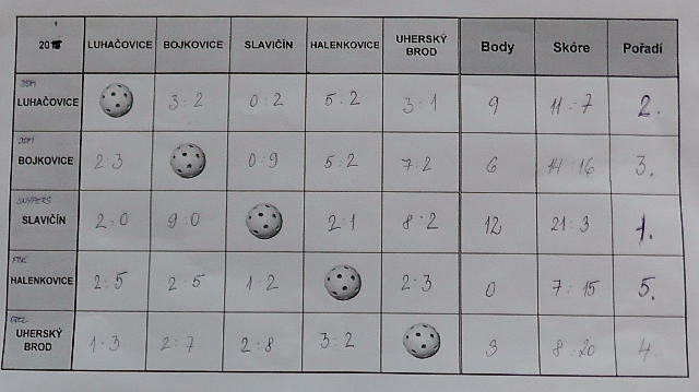 V našem posledním utkání na turnaji, proti Halenkovicím jsme si chtěli spravit chuť z předchozího zápasu. Výborný výkon předváděl celý tým. Gólové zářezy Jakuba Pláška, 2x Tomáše Martince a 2xMartina Miklase znamenali vítězství 5:2. Náš tým se usadil s devíti body na konečném krásném 2. místě.