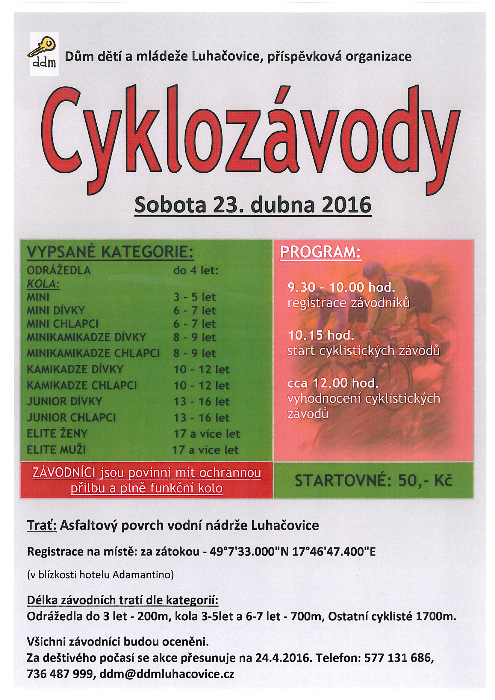 „Registrace účastníků probíhá ale už od půl desáté. Závody by se měly zvládnout během dopoledne a budou připraveny na třech tratích. Dvousetmetrová určená pro děti do tří let na odrážedlech, sedmisetmetrová pro účastníky kategorií do sedmi let a nejdelší 1,7 kilometru pro starší účastníky," sdělila Tomalová. Bližší informace a podmínky účasti uvádíme níže na plakátcích. Vzhledem k tomu, že obě akce jsou venkovního charakteru, závisí však jejich konání na počasí. „Akce v parku u zámku se v případě deštivého počasí nekoná, cyklozávody na přehradě se případně přesune na další den, tedy neděli 24.dubna," poznamenala Tomalová.
