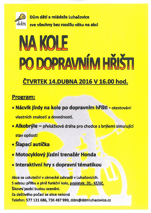 „Děti budou mít možnost nácviku jízdy na dopravním hřišti. Příchozí si budou ale moci v roli chodce vyzkoušet i takzvané alkobrýle, které simulují vnímání ve stavu opilosti. S těmito brýlemi budou absolvovat přichystanou překážkovou dráhu," nastínila ředitelka DDM Luhačovice Eva Tomalová. Na akci přitom nebudou chybět ale ani šlapací autíčka, motocyklový jízdní trenažér Honda nebo interaktivní hry s dopravní tématikou.