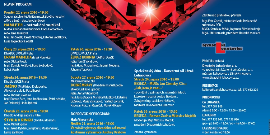 Přehlídka komorní divadelní tvorby se tentokrát koná od 21. do 27. srpna a lidé na ní uvidí jak netradiční muzikál „Hamlet!!!“ v podání Souboru absolventů Ateliéru muzikálového herectví Jamu v Brně, tak také další představení plná jmen populárních herců.
