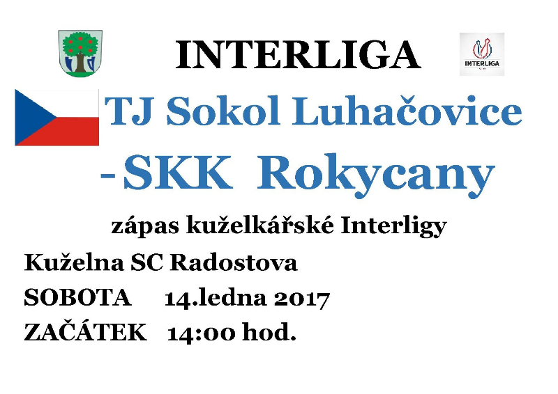 V té hraje společně nejlepších 12 kuželkářských týmů České republiky a Slovenska a nechybí v ní právě ani úspěšní reprezentanti lázeňského města. V prvním letošním domácím utkání Interligy hraném na kuželně SC Radostova vyzve kuželkářský odíl TJ Sokol Luhačovice soupeře z SKK Rokycany v sobotu 14. ledna. Utkání začíná ve 14 hodin. Pozvánku na toto i na další domácí utkání bude možné nalézt na www.luhacovice.cz také v kalendáři akcí.