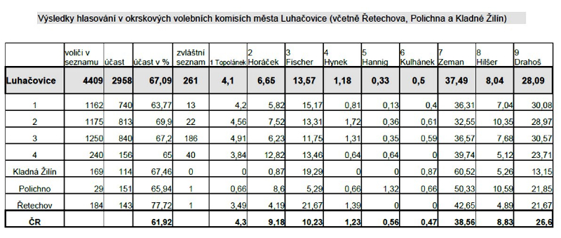 "V prvním kole prezidentských voleb bylo v Luhačoviccíh do seznamu voličů zapsáno celkem 4409 občanů. Volební účast v našem městě byla díky návštěvníkům města 67,09%, pokud bychom brali v úvahu jen občany města, byla by účast 66,03%," informaovala vedoucí Správního odboru luhačovické radnice Vladislava Janíková. Volby v lázeňském městě proběhly bez komplikací. "Hlasování proběhlo v pořádku, bez přerušení, rovněž sčítání hlasů mělo hladký a nerušený průběh," poznamenala Janíková. Celkově se přitom v Luhačovicících a jejich místních částech dostavilo hlasovat 2695 občanů Luhačovic a 263 lázeňských hostů.