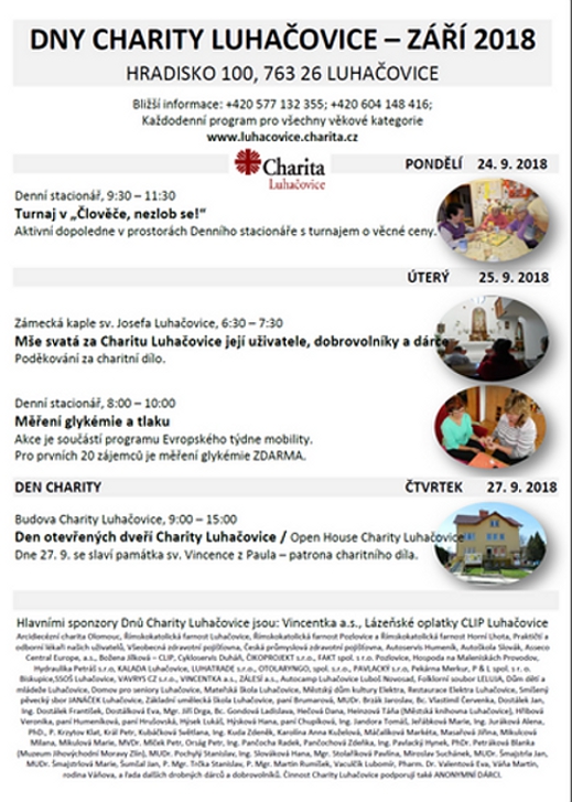 Ve výčtu programů letošních Dnů Charity Luhačovice nemůže chybět samozřejmě ani Den otevřených dveří. Více na plakátku nebo na www.luhacovice.charita.cz .