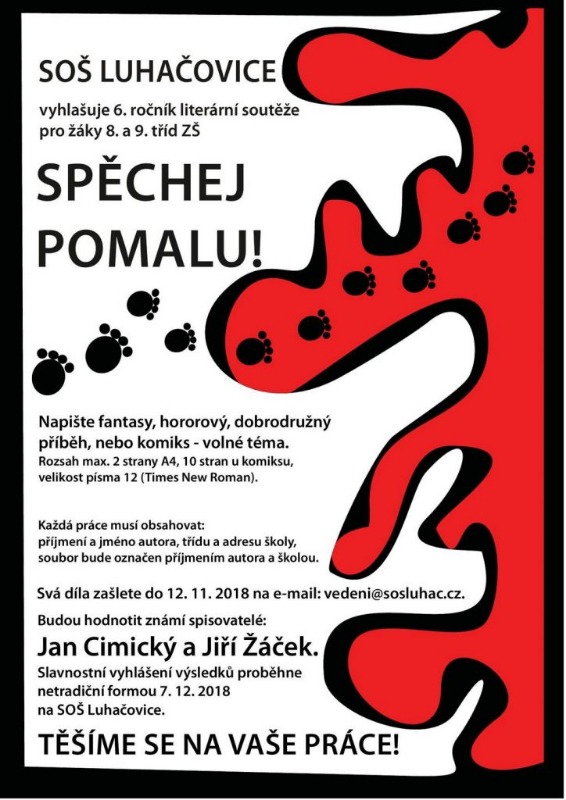 Své práce mohou žáci tvořit v různých žánrech a téma je letos volné. Čas k zaslání příspěvků mají mladí talentování literáti do 12. listopadu, a to e-mailem na adresu vedeni@sosluhac.cz . Soutěž, v jejíž porotě bude už tradičně také básník Jiří Žáček a známý lékař a literát Jan Cimický, bude zhodnocena na vyhlášení vítězů na SOŠ Luhačovice začátkem prosince.