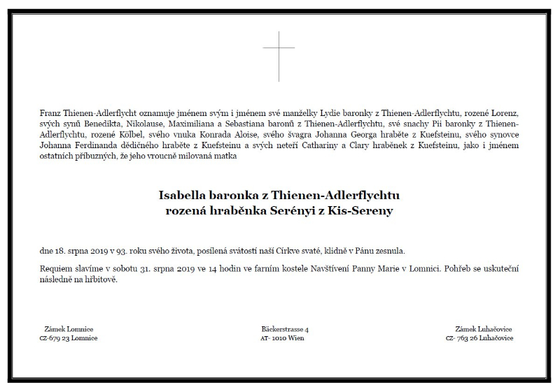Rod Serényiů byl neodmyslitelně s Luhačovicemi a okolím spjat po několik staletí a měl také zásadní podíl na vybudování zdejších lázní. Isabella Thienen-Adlerflycht byla dcerou hraběte Aloise Serényiho, který byl vlastníkem luhačovického panství až do konfiskace po 2. světové válce. Isabella Thienen-Adlerflycht v útlém dětství žila s rodinou také na luhačovickém zámku. Po válce žila v zahraničí, později po Sametové revoluci zažádala o navrácení majetku zabaveného dříve jejímu otci. Restituční řízení se táhlo ovšem po dlouhá léta. O nároku na restituce rozhodly úřady až cca před třemi lety, kdy bylo zpětně potvrzeno, že Alois Serrényi byl i po válce československým občanem a na majetek se tak restituce vztahují. Navrácen byl tak nedávno rozsáhlý rodový majetek zejména v Luhačovicích (šlo kromě jiného o zámek, lesy a pozemky), ale také v Lomnici u Tišnova na Blanensku, kde se nachází další z rodových sídel. Právě v kostele v Lomnici se uskuteční 31. srpna zádušní mše za zesnulou, pochována bude na lomnickém hřbitově. Jak je uvedeno v smutečním oznámení o úmrtí, Isabella Thienen-Adlerflycht zesnula v 93. roce svého života. Vzhledem k jejímu věku tak v posledních letech správu znovu nabytého rodového majetku řešil její poslední žijící syn Franz Thienen-Adlerflycht a jeho rodina.