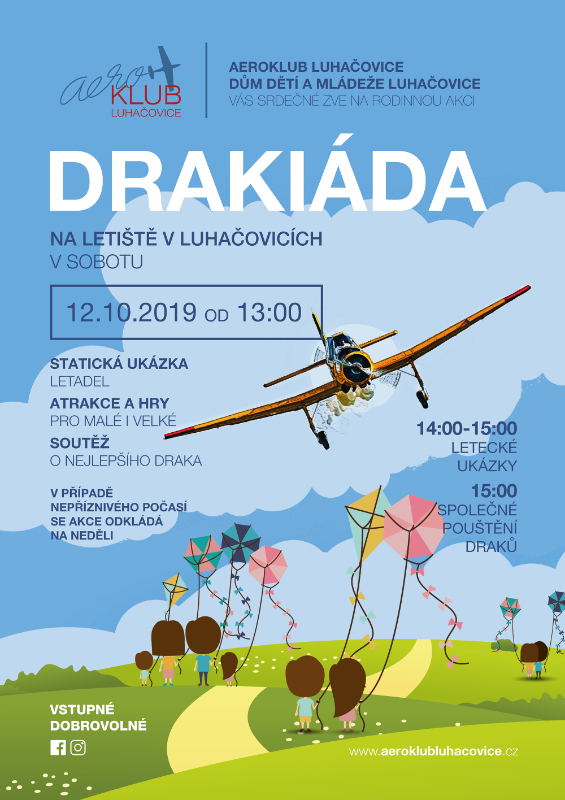 Na oblíbenou akci na luhačovickém letišti se mohou děti i dospělí těšit v sobotu 12. října a opět ji společně pořádají Aeroklub Luhačovice a místní Dům dětí a mládeže. Program bude bohatý. Nebude chybět samozřejmě pouštění draků a různé soutěže s tím spojené. Aeroklub již tradičně představí také svá letadla, která si budou moci lidé prohlédnout nejen na zemi, ale i při letekých ukázkách. Dům dětí a mládeže chystá pro děti řadu stanovišť s různými hrami a soutěžemi a všichni se mohou těšit na možnost občerstvení. Prozatím je předpověď počasí na víkend více než příznivá, takže to vypadá, že na všechny příchozí čeká opět velmi podařená akce a na letišti nad Luhačovicemi se sejdou opět stovky lidí. Akce začíná ve 13 hodin, společné pouštění draků je plánováno od 15 hodin. Předtím se představí v akci letadla místního Aeroklubu.