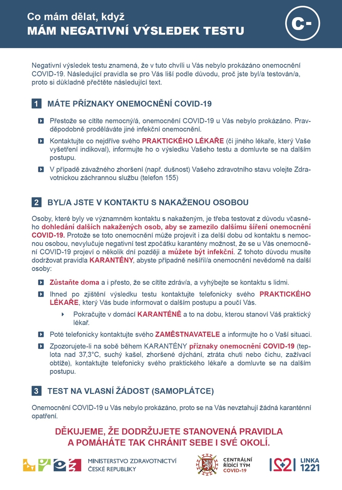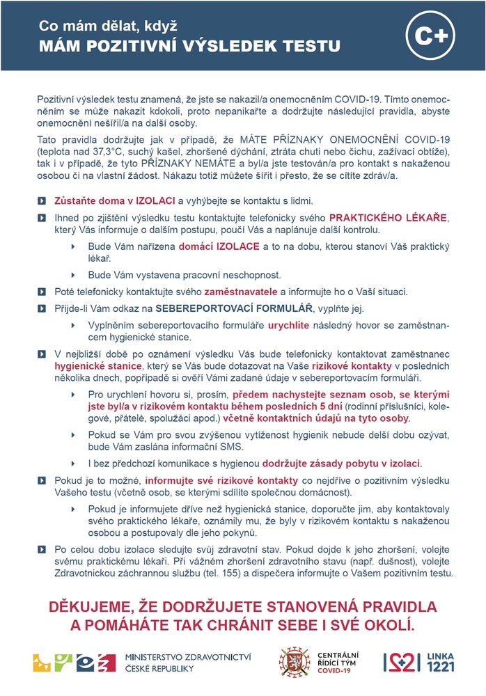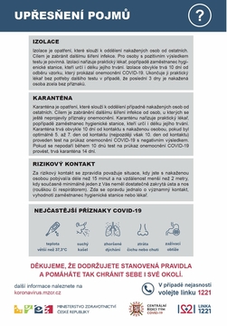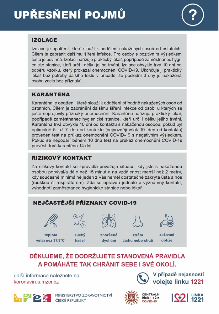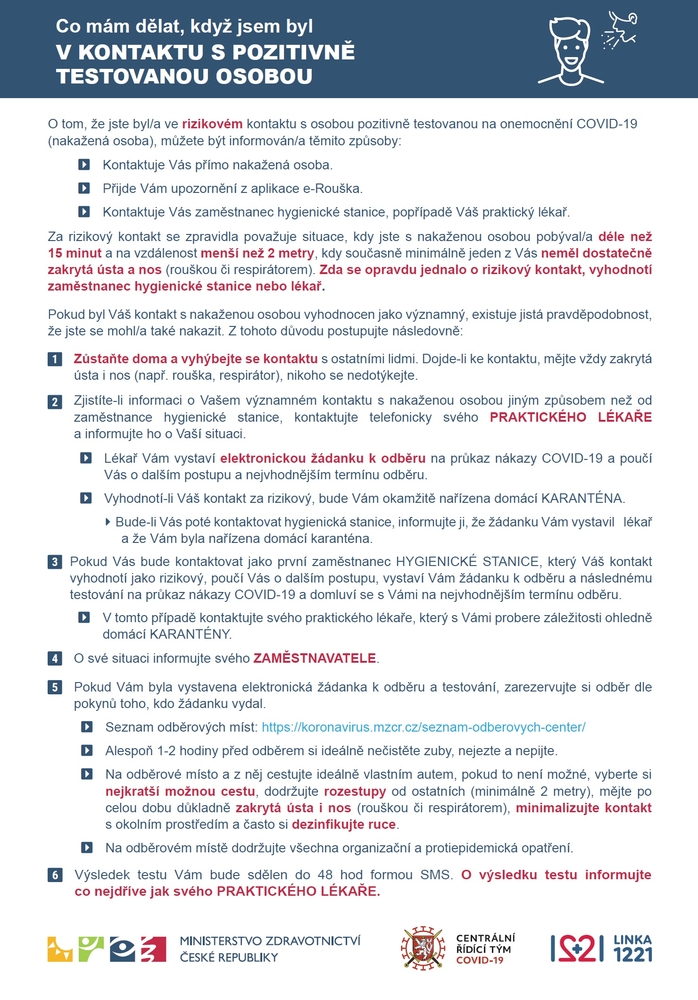 Současná snaha zvládnout epidemii COVID-19 se dotýká nás všech a je dobré vědět, jak se chovat v jednotlivých situacích, do kterých se můžeme v této souvislosti dostat. Nelze vyloučit, že i přes veškerou snahu se právě my nebo někdo z našich blízkých buď přímo nakazí, nebo bude mít příznaky, případně zjistíme, že jsme byli v kontaktu s někým pozitivním na COVID-19. Jde o to, umět se v dané situaci vhodně zachovat. Objasnění některých pojmů a přesné návody, co v konkrétní situaci dělat, nabízíme v pěti letácích Ministerstva zdravotnictví ČR, které uvádíme níže.