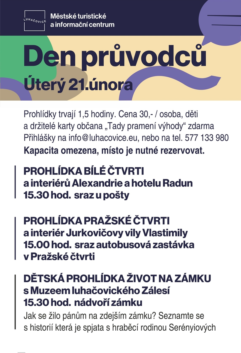 Dozvíte se více o luhačovické architektuře, podíváte se na místa, která byste sami jen tak nenavštívili. Prohlídka Bílá čtvrť spojená s návštěvou interiéru Alexandrie a hotelu Radun začíná v 15.30 hod. u pošty. Pokud chcete vědět více o Pražské čtvrti a lákají vás vnitřní prostory Jurkovičovy vily Vlastimily, sraz je v 15.00 hod. na zastávce Pražská čtvrť. Případně můžete zajít na speciální Dětskou prohlídku s Muzeem luhačovického Zálesí, která láká na život na zámku. Začátek je v 15.30 hod. na nádvoří. Seznámíte se s historií zámku v Luhačovicích, která je spjata s hraběcí rodinou Serényiových. Vyzkoušíte si na chvilku život zámeckého pána či paní.