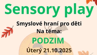 Po velkém úspěchu předchozí lekce zveme rodiče s nejmenšími dětmi (1,5- 5 let) na další SMYSLOVÉ HRANÍ, které proběhne v úterý 21. 10. od 16:00. Tématem říjnového sensory play je PODZIM A HALLOWEEN.Lekce je omezená početem dětí, proto zájemce žádáme o včasnou rezervaci.