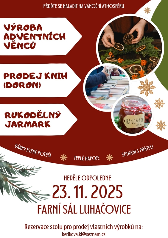 Kdo může DAROVAT CHVOJÍ na výrobu věnců nebo chce REZERVOVAT STŮL pro PRODEJ SVÝCH VÝTVORŮ, prosíme napište na mail betikova.kl@seznam.cz.